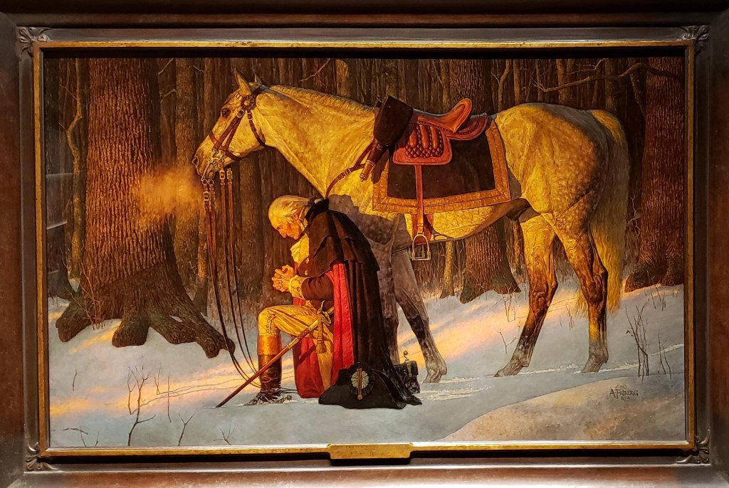 On one of the levels, we discovered several Tiffany stained glass windows: beautiful works of art that portrayed religious scenes or people of the New Testament. There was also the famous painting of George Washington, kneeling in the snow next to his horse, eyes closed, hands folded, and praying.